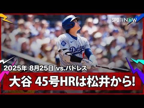 大谷翔平 リーグトップタイ45号!首位攻防最終戦で松井裕樹から待望の一発 前日に首位陥落 敵地騒然 [ 2025年8月25日 07:34 ]スポニチ ナ・リーグ ドジャース―パドレス ( 2025年8月24日 サンディエゴ ) ドジャースの大谷翔平投手(31)が24日(日本時間25日)、敵地でのパドレス戦に「1番・DH」で先発出場。4打席安打なく迎えた第5打席で松井裕樹投手(29)から出場4試合ぶりの一発となる45号が飛び出し、リーグトップのフィリーズ・シュワバーに並んだ。・ついに翔平!やっと出たな。
