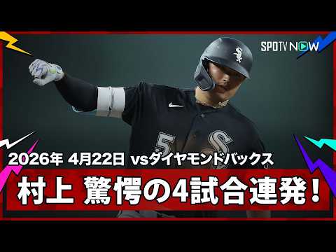 村上宗隆また“快弾” 第2打席に4戦連発弾で年間63発の脅威モード 元ヤクルト敵将も苦笑い [ 2026年4月22日 11:12 ]スポニチアネックス インターリーグ ホワイトソックス-ダイヤモンドバックス ( 2026年4月21日 フェニックス ) またまた快弾だ!ホワイトソックスの村上宗隆内野手(26)が21日(日本時間22日)、ダイヤモンドバックス戦に「2番・一塁」で先発出場。第2打席で自身今季初の4試合連発となる第9号をマークした。 打球速度は113マイル(約182キロ)、飛距離426フィート(約130メートル)、角度30度の一撃。柵越えした白球に敵地ファンもあ然としていた。・村上は一体いつになったら止まるんだ。このペースでホームランを打ち続けられたら、シーズンが終わる頃にはとんでもない数字になっているはずだ。